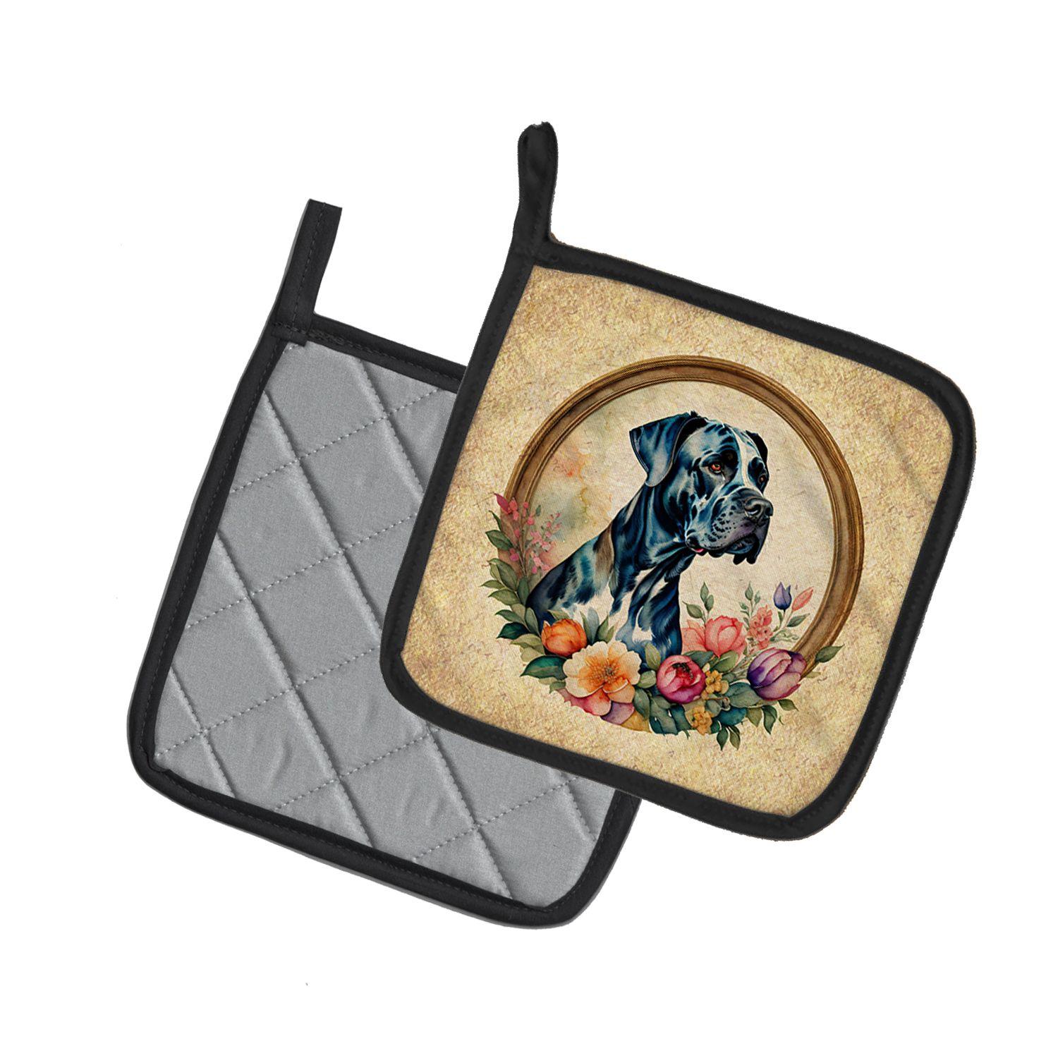 Pair of Pot Holders featuring breed specific Great Dane artwork. A Pair of Pot Holders to match your kitchen decor. Made in the USA these are thick and functional. Full color artwork decorates the front polyester fabric of the hot pad and accented by a black trim. Use these at as a trivet for your Thanksgiving or Christmas tablescape. Filled with insulated fabric and quilted for durability. These colorful pot holders will make a great gift for your favorite home cook or executive chef. Each pot holder measures approximately 7 1/2 inches by 7 1/2 inches. A hanging tab is included.