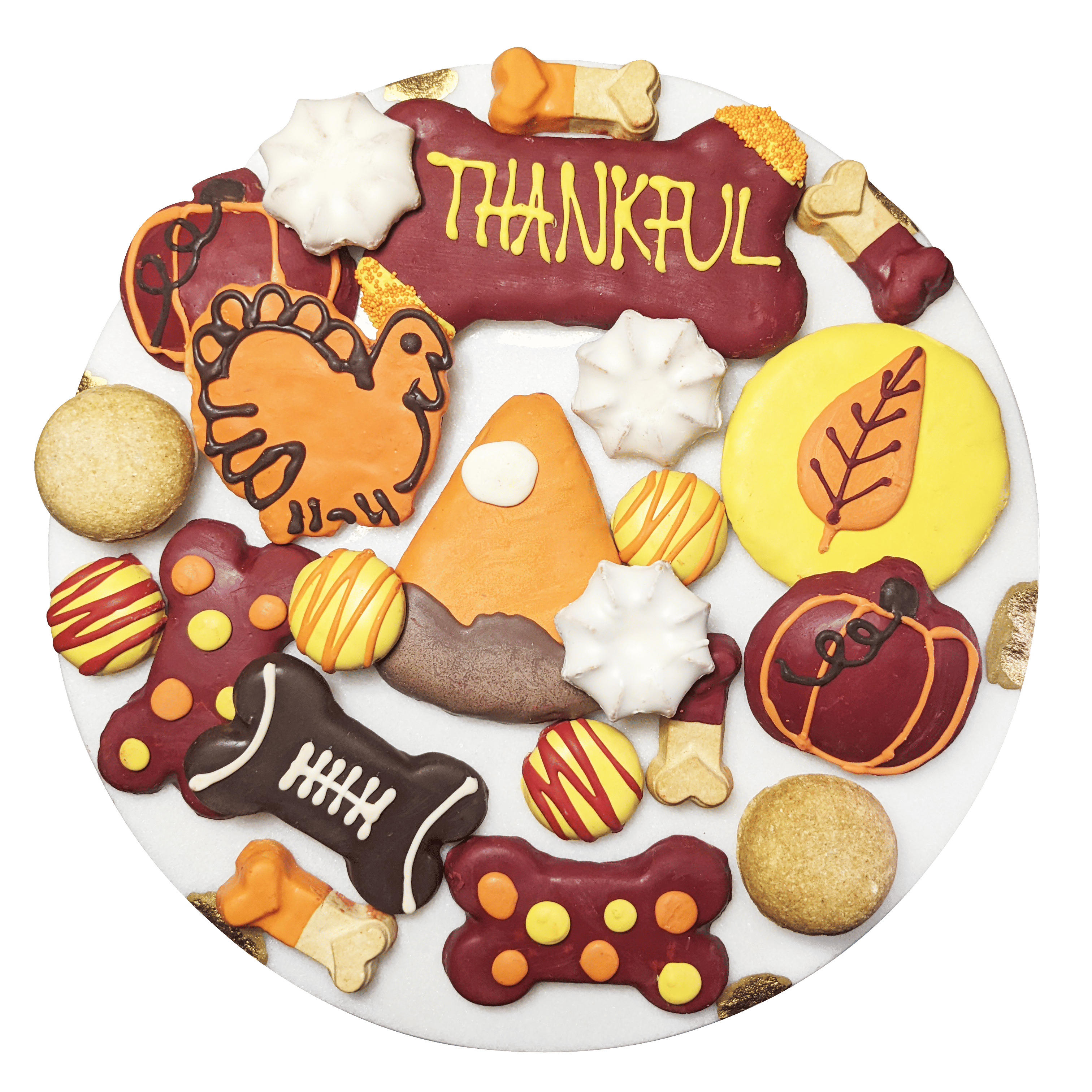 Includes 22 themed treats including autumn leaf, pumpkin pie, and turkey shaped biscuits accompanied by dog macarons, dog bones etc.